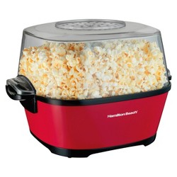 It comes in a 6 and 8 quart model with a butter melting well and a top that doubles as a popcorn bowl.