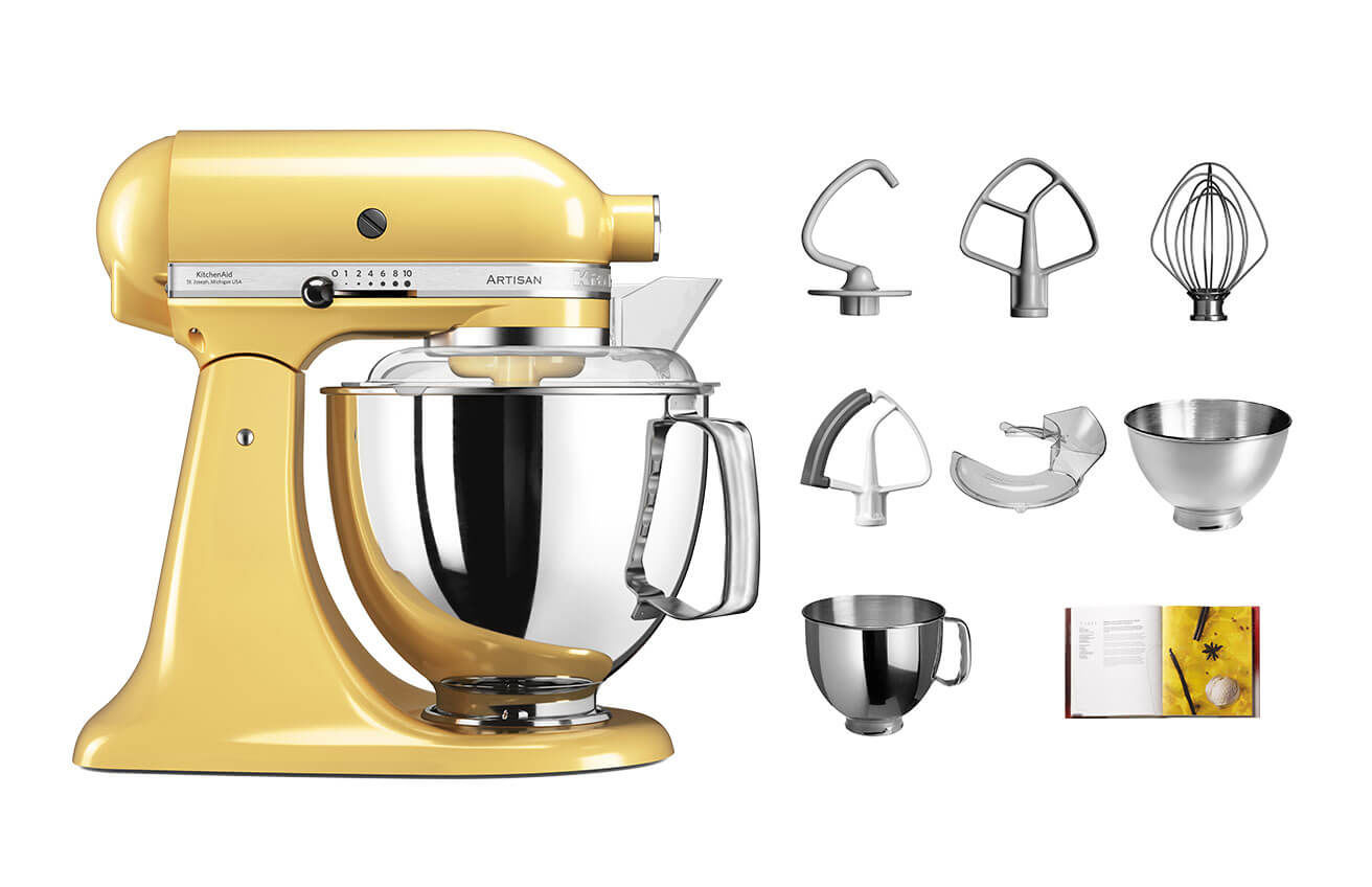 Yellow kitchenaid stand mixer.